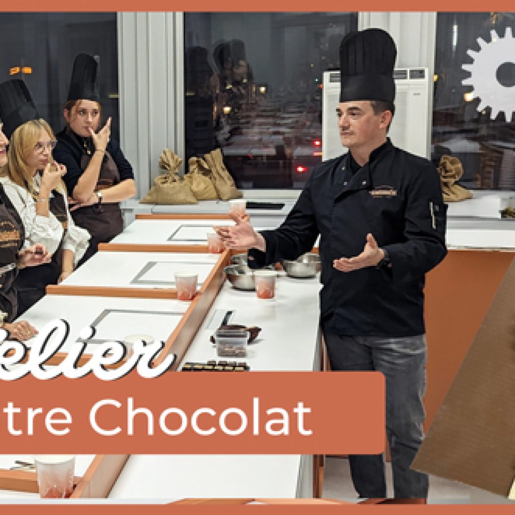 – L’Atelier chocolaté : Les participants deviennent artisans d’un jour. Ils réalisent leur propre tablette de chocolat (lait ou noir) et la personnalisent selon leurs envies grâce à une large palette de toppings gourmands (éclats de noisettes, amandes caramélisées, pistaches, fruits séchés, etc.).