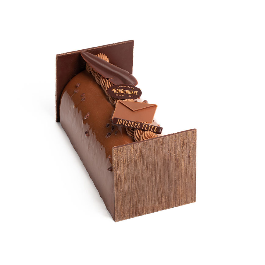 The timeless Bûche Royale, with its feuillantine crunch, chocolate cookie and 65% Maracaibo dark chocolate mousse, takes you on a gourmet chocolate journey that will light up the palates of all chocolate lovers.