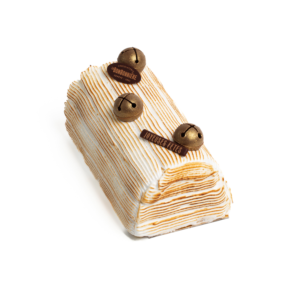 This fresh, light dessert is the perfect way to round off a festive meal, with an almond cookie, vanilla ice cream and Italian meringue. A flask of Grand Marnier is provided for flambéing the log. For 4/6 people.