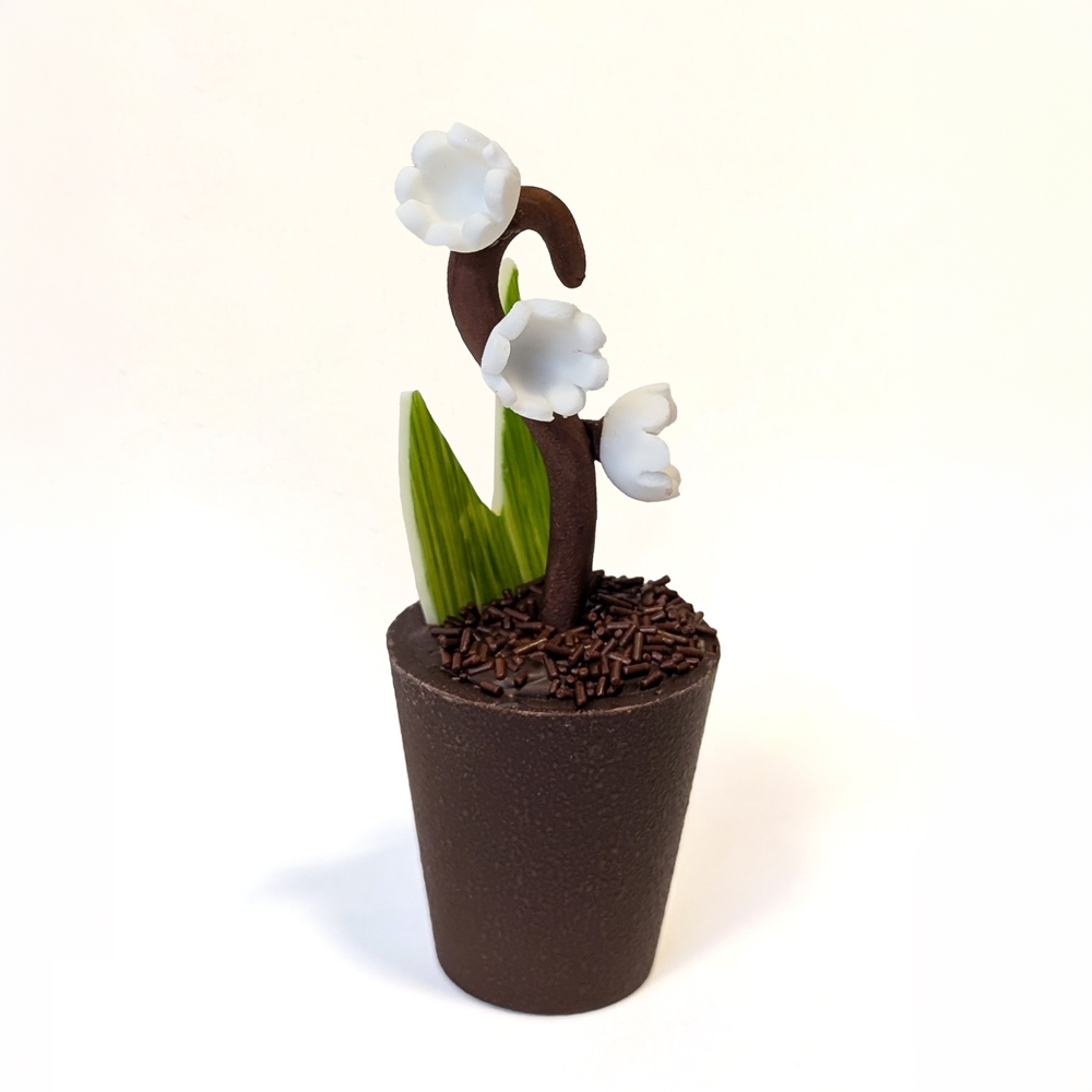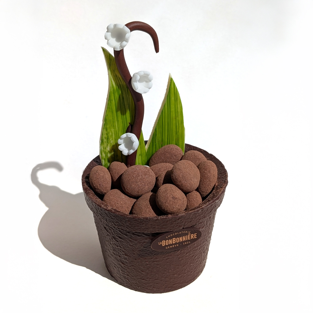 Sweet sprigs of lily of the valley, white chocolate leaves and a pot of praline feuillantine to wish luck and happiness with a touch of indulgence to your loved ones.