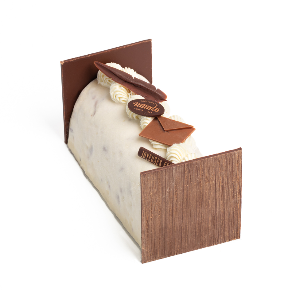 La bûche Frisson composée d’un biscuit moelleux à la noisette et d’un délicat praliné vanille amande, accompagné d’une mousse vanille et d’un confit fruits rouge offre un ensemble doucement sucré qui fera voyager les papilles du plus grand nombre. Douceur et légèreté se mêlent en bouche pour une explosion de saveurs et de textures fruitées et réconfortantes.