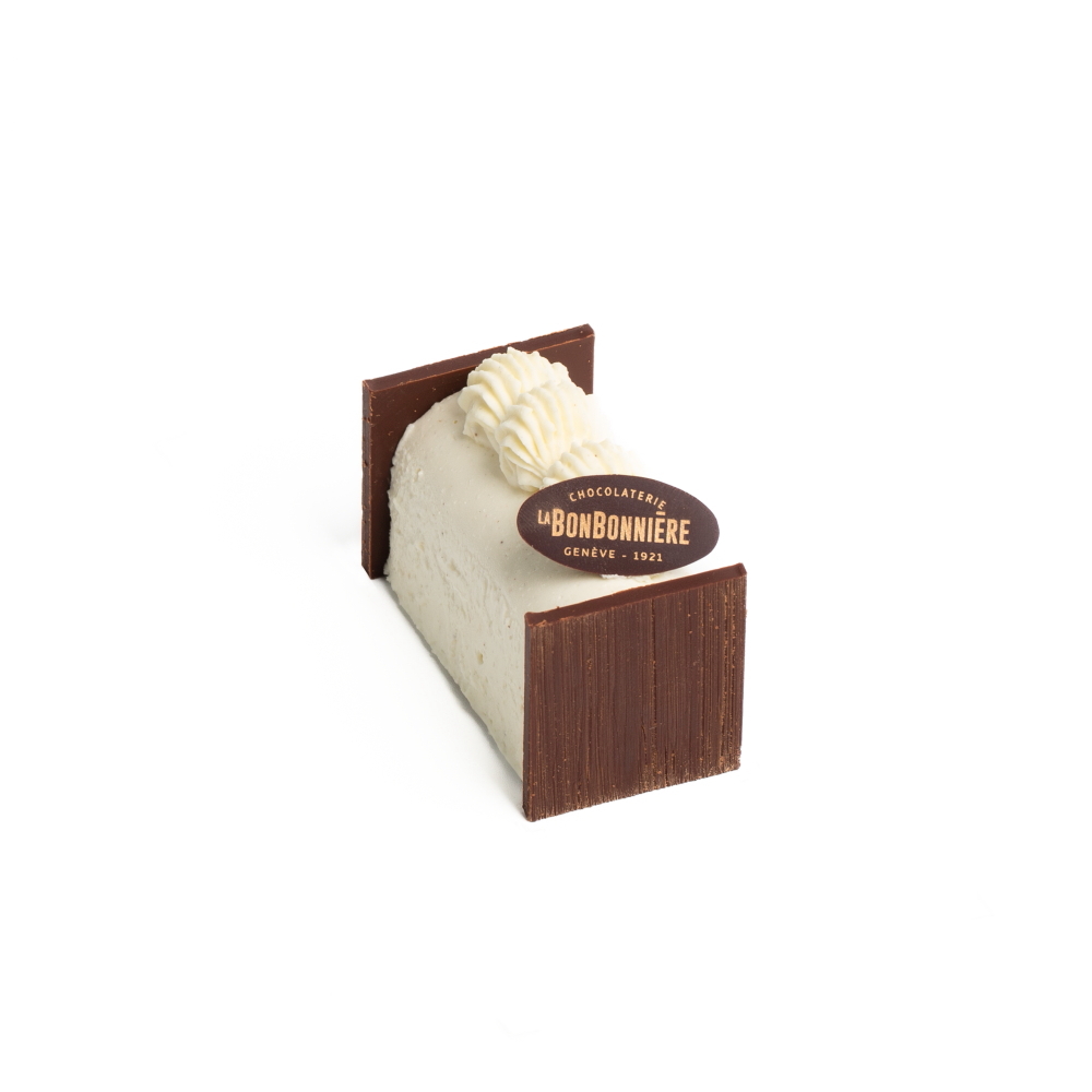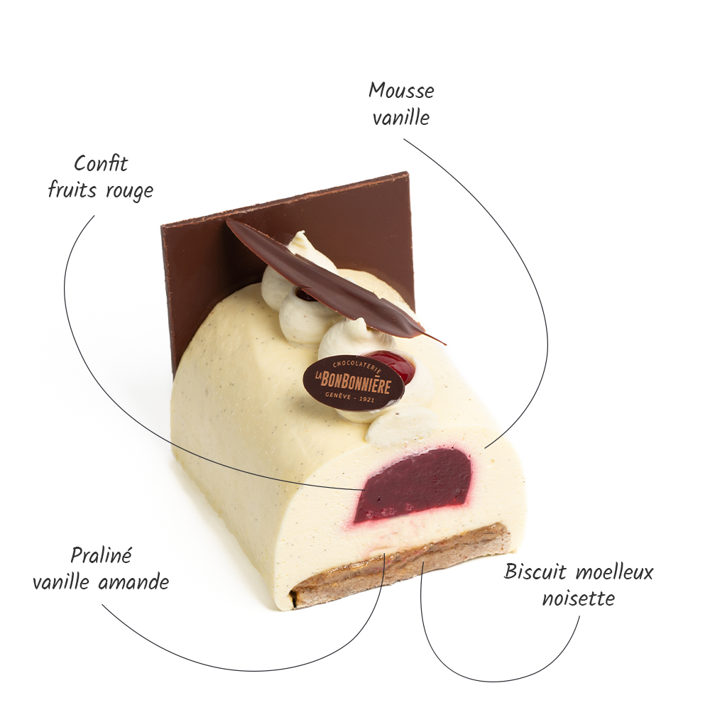 La bûchette Frisson composée d’un biscuit moelleux à la noisette et d’un délicat praliné vanille amande, accompagné d’une mousse vanille et d’un confit fruits rouge offre un ensemble doucement sucré qui fera voyager les papilles du plus grand nombre. Douceur et légèreté se mêlent en bouche pour une explosion de saveurs et de textures fruitées et réconfortantes.
